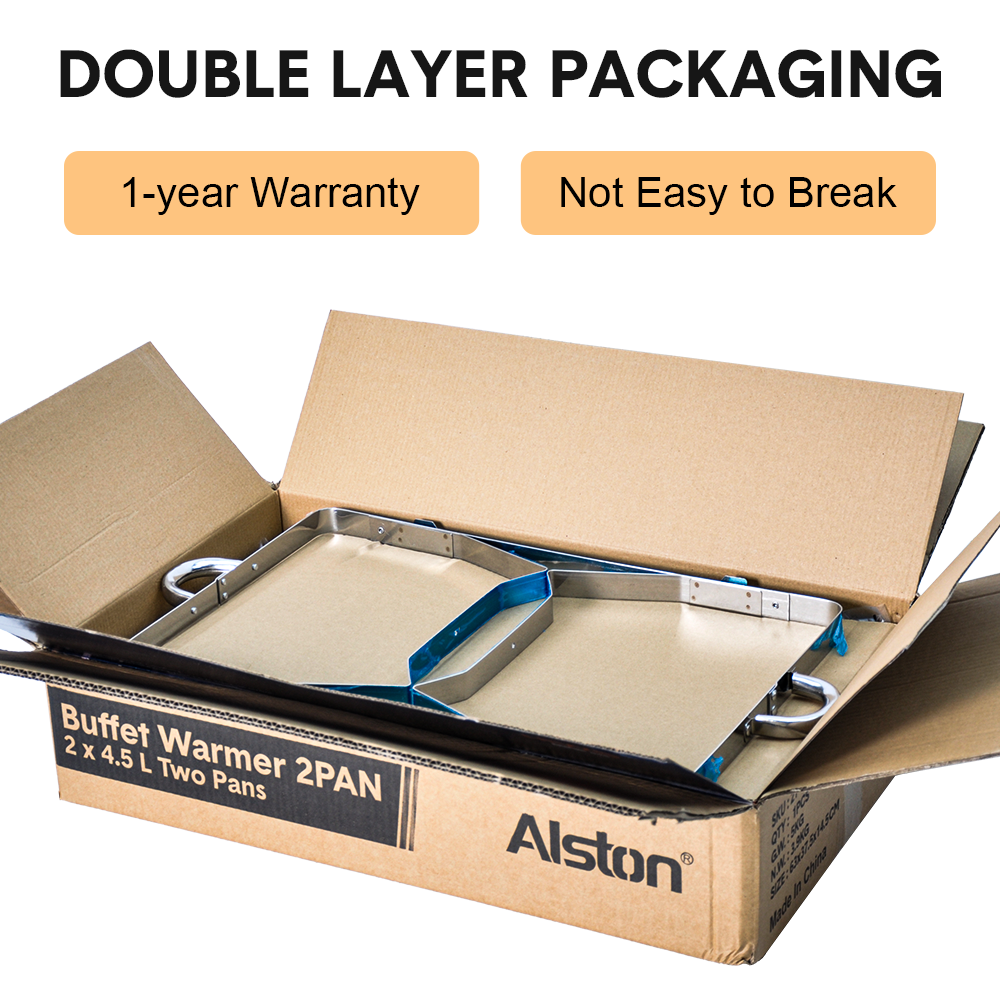 - 2 Pan Bain Marie: This chafing dish set contains 1 foldable frame,2 safety fuel holders,1 water pan,1 cover, and two 4.5L food pans which can can hold different foods at the same time.The chafing dish also has handles to ensure that the product can be moved with ease.