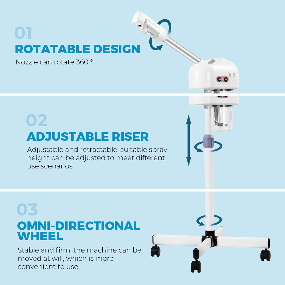 This Professional Facial Steamer is helping restore the skin, promoting blood circulation and allowing treatments to better penetrate the skin barrier and nutrients to absorb.Ideal for beauty salon or personal care use at home. The steamer features a sturdy base with 5 swivel castors for mobilit. It can not only promote thorough facial cleansing,but hydrate the skin,improving moisture retention.