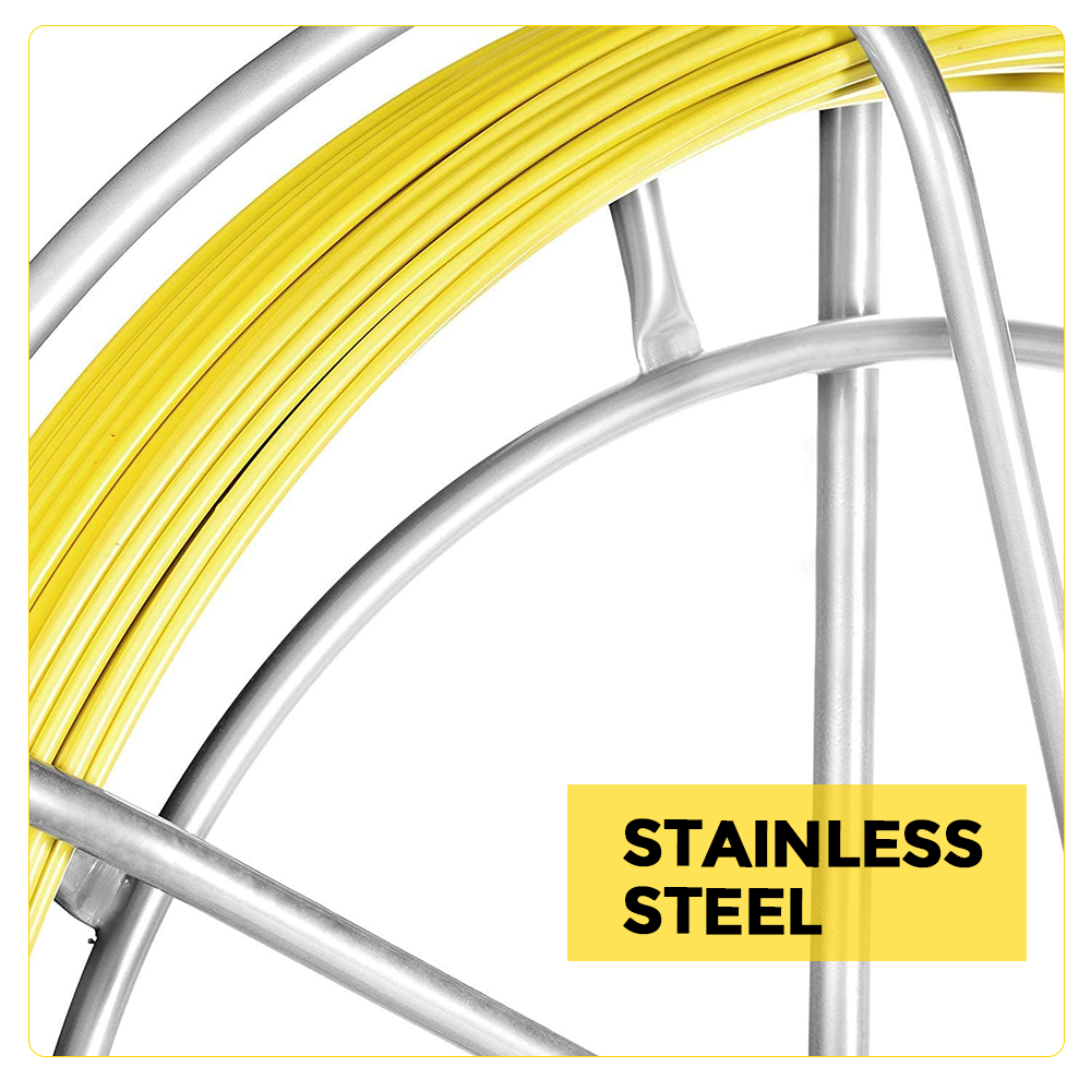 This 8mm 150M Fish Tape Fiberglass Rodder with Steel Reel Cage is a versatile tool for cable ducts, telecom and guiding wires,featuring a non-conductive design for safety.