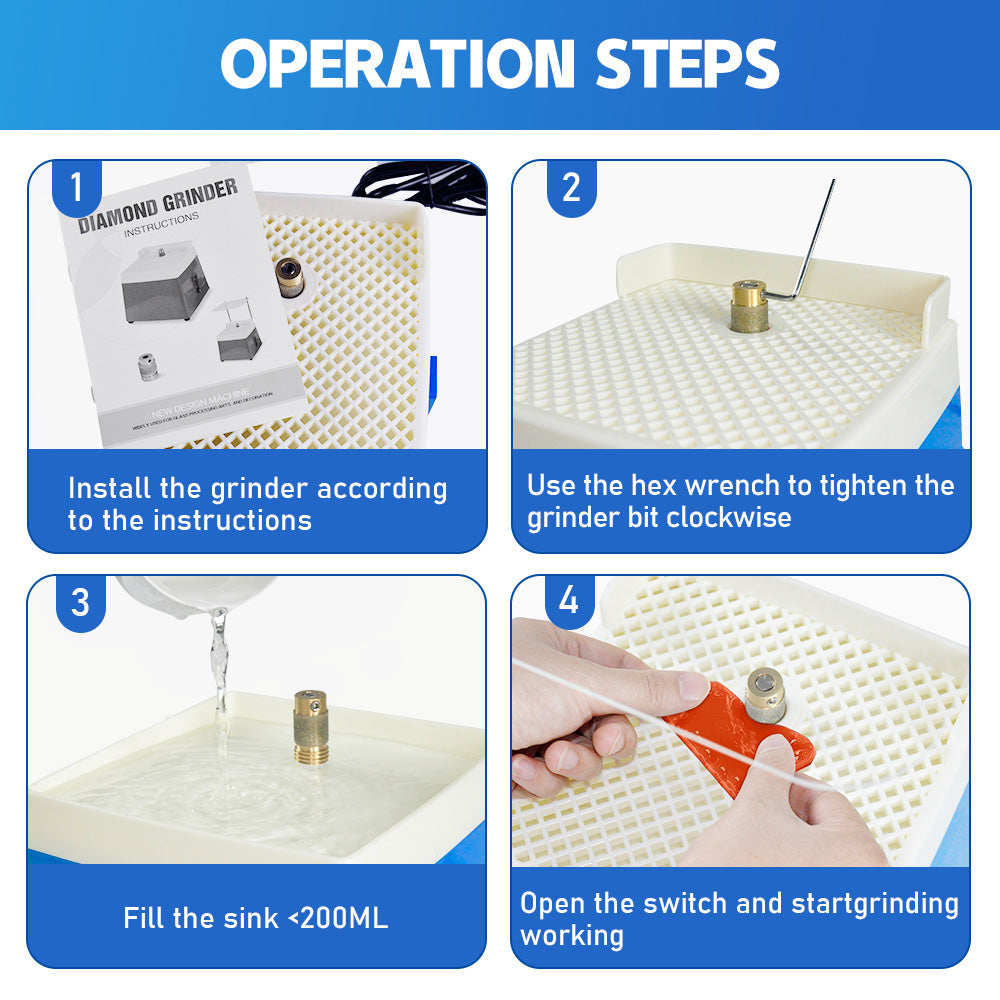 - Easy Operation: This glass grinder features automatic operation for added convenience. You can fix grinding wheel on the shaft with hexagonal wrench clockwisely.