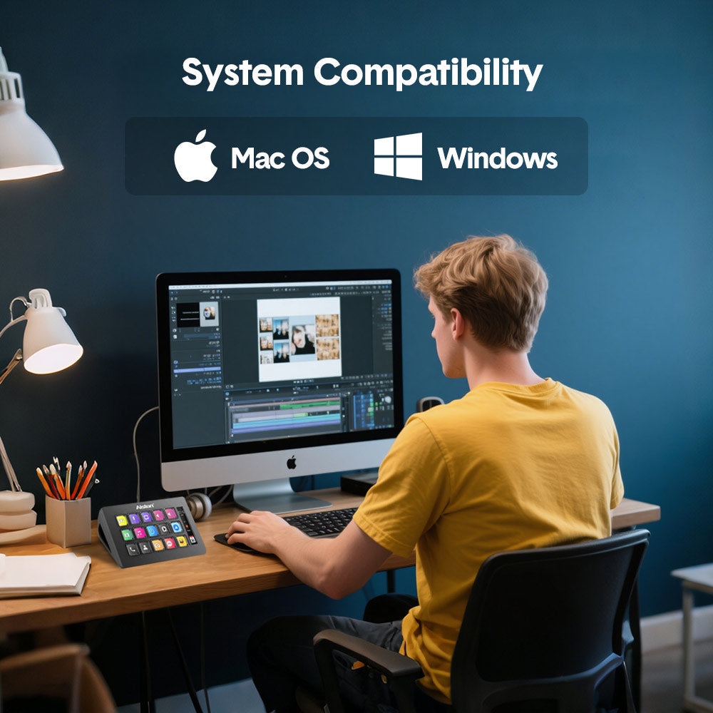 - Wide Compatibility: The stream dock is compatible with Windows and Mac OS systems, supporting hotkey setup for a wide range of mainstream software, including Facebook, OBS, Twitch, Stream labs, XSplit, YouTube, Discord, Spotify, Adobe Premiere Pro, Photoshop, Microsoft Office, and more.