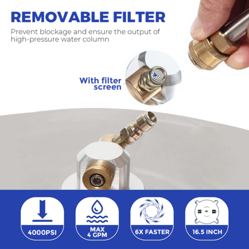 This 16.5'' high-pressure surface cleaner is a powerful tool for efficient cleaning of large flat surfaces such as patios, driveway, sidewalk or deck, boasting a stainless steel build and compatibility with 2000-4000PSI pressure washers.