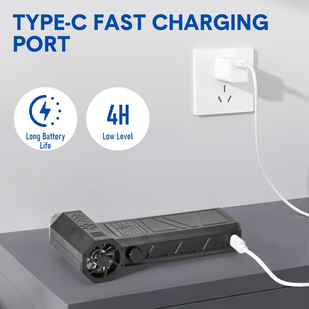 - Rechargeable 8000mAh Battery: This mini jet fan comes with 2 built-in batteries, each with a 4000mAh capacity, and total is 8000mAh. Included Type-C interface cable provides efficient and convenient charging. On a full charge, it delivers up to 4 hours of operation on low-speed and 10–15 minutes on turbo mode.